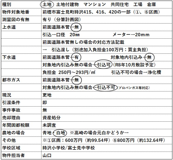 | コメント | ※物件等についてのお問い合わせは、可能な限りメールやFAXにてお願い致します。 電話でのお問い合わせの場合には、担当者が電話対応中や外出中の場合には出られない事が ありますので、ご理解いただけると助かります。 ⑥区画 □上水道;売主負担(負担金100万;買主) □白地の農地 □送電線下制約有り カーナビ入力;前橋市富士見町4153付近 【動画公開中】 |