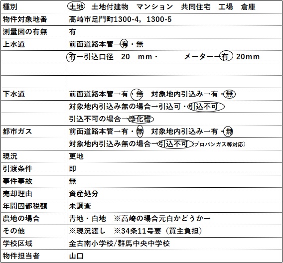 コメント | 物件等についてのお問い合わせは、可能な限りメールやFAXにてお願い致します。 電話でのお問い合わせの場合には、担当者が電話対応中や外出中の場合には出られない事が ありますので、ご理解いただけると助かります。 カーナビ入力:高崎市足門町1300-4 |