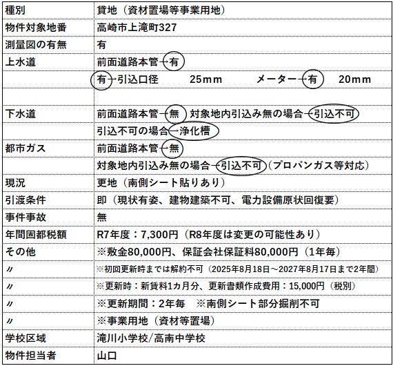 コメント | 物件等についてのお問い合わせは、可能な限りメールやFAXにてお願い致します。 電話でのお問い合わせの場合には、担当者が電話対応中や外出中の場合には出られない事が ありますので、ご理解いただけると助かります。 カーナビ入力:高崎市上滝町325付近 |