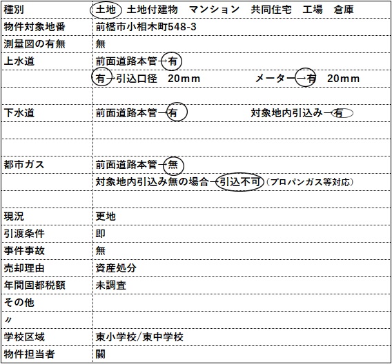 コメント | 物件等についてのお問い合わせは、可能な限りメールやFAXにてお願い致します。 電話でのお問い合わせの場合には、担当者が電話対応中や外出中の場合には出られない事が ありますので、ご理解いただけると助かります。 カーナビ入力:前橋市小相木町547-1付近 |