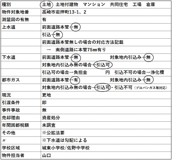 コメント | 物件等についてのお問い合わせは、可能な限りメールやFAXにてお願い致します。 電話でのお問い合わせの場合には、担当者が電話対応中や外出中の場合には出られない事が ありますので、ご理解いただけると助かります。 カーナビ入力:高崎市岩押町37-27付近 |
