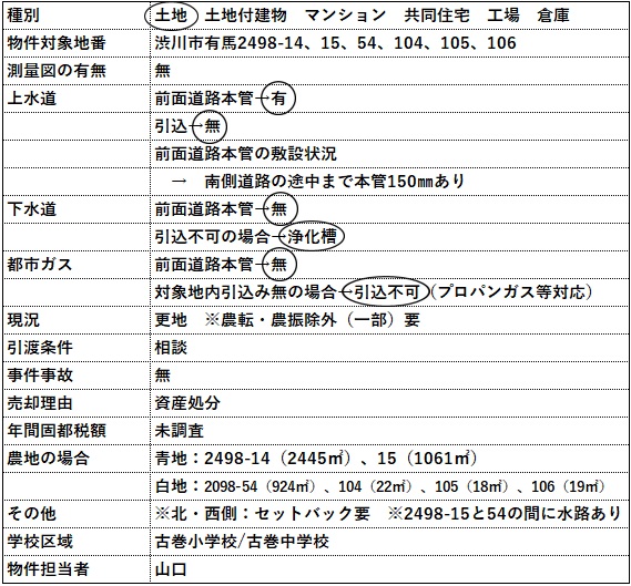 コメント | 物件等についてのお問い合わせは、可能な限りメールやFAXにてお願い致します。 電話でのお問い合わせの場合には、担当者が電話対応中や外出中の場合には出られない事が ありますので、ご理解いただけると助かります。 カーナビ入力:渋川市有馬2498-14付近 |