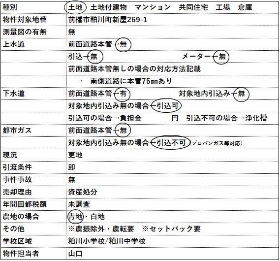 コメント | 物件等についてのお問い合わせは、可能な限りメールやFAXにてお願い致します。 電話でのお問い合わせの場合には、担当者が電話対応中や外出中の場合には出られない事が ありますので、ご理解いただけると助かります。 カーナビ入力:前橋市粕川町新屋269-4付近 |