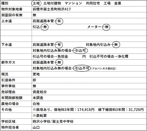 コメント | 物件等についてのお問い合わせは、可能な限りメールやFAXにてお願い致します。 電話でのお問い合わせの場合には、担当者が電話対応中や外出中の場合には出られない事が ありますので、ご理解いただけると助かります。 カーナビ入力:前橋市富士見町時沢437-1付近 |