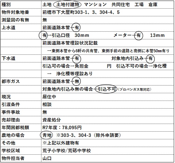 コメント | 物件等についてのお問い合わせは、可能な限りメールやFAXにてお願い致します。 電話でのお問い合わせの場合には、担当者が電話対応中や外出中の場合には出られない事が ありますので、ご理解いただけると助かります。 ※建物の見学を希望されるお客様へのお願いです。 カーナビ入力:前橋市下大屋町303-1 □居住中の為、内見は事前予約が必要です。 |