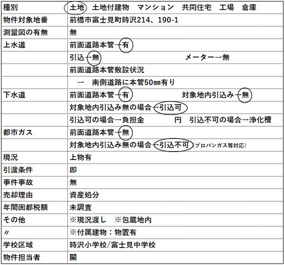 | コメント | 物件等についてのお問い合わせは、可能な限りメールやFAXにてお願い致します。 電話でのお問い合わせの場合には、担当者が電話対応中や外出中の場合には出られない事が ありますので、ご理解いただけると助かります。 カーナビ入力:前橋市富士見町時沢214付近 □上物有(現況渡し) |