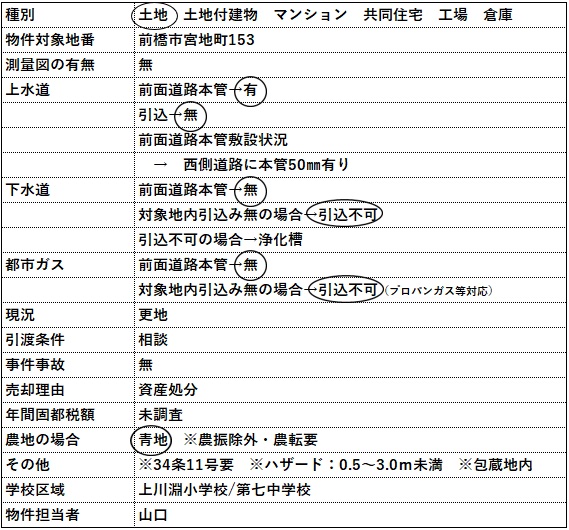 | コメント | 物件等についてのお問い合わせは、可能な限りメールやFAXにてお願い致します。 電話でのお問い合わせの場合には、担当者が電話対応中や外出中の場合には出られない事が ありますので、ご理解いただけると助かります。 カーナビ入力:前橋市宮地町146-1付近 |