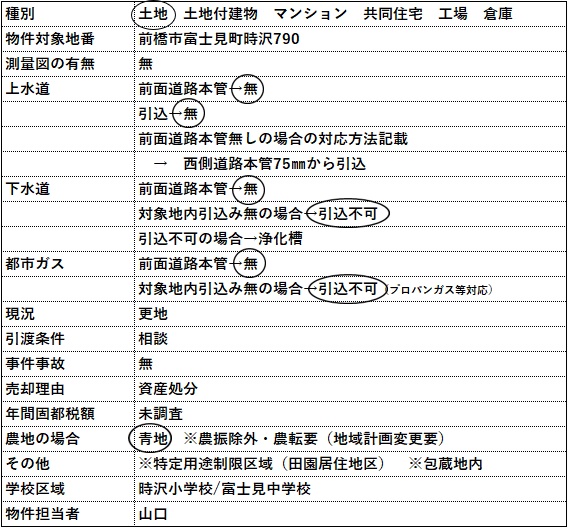 | コメント | 物件等についてのお問い合わせは、可能な限りメールやFAXにてお願い致します。 電話でのお問い合わせの場合には、担当者が電話対応中や外出中の場合には出られない事が ありますので、ご理解いただけると助かります。 カーナビ入力:前橋市富士見町時沢801付近 【動画公開中】 |
