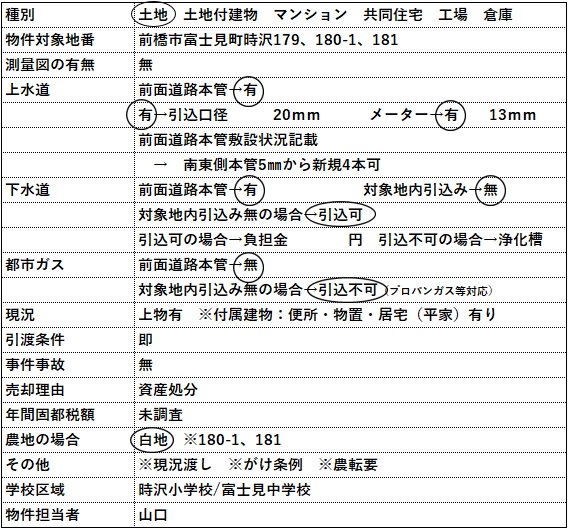 | コメント | 物件等についてのお問い合わせは、可能な限りメールやFAXにてお願い致します。 電話でのお問い合わせの場合には、担当者が電話対応中や外出中の場合には出られない事が ありますので、ご理解いただけると助かります。 カーナビ入力:前橋市富士見町時沢179付近 【動画公開中】 |