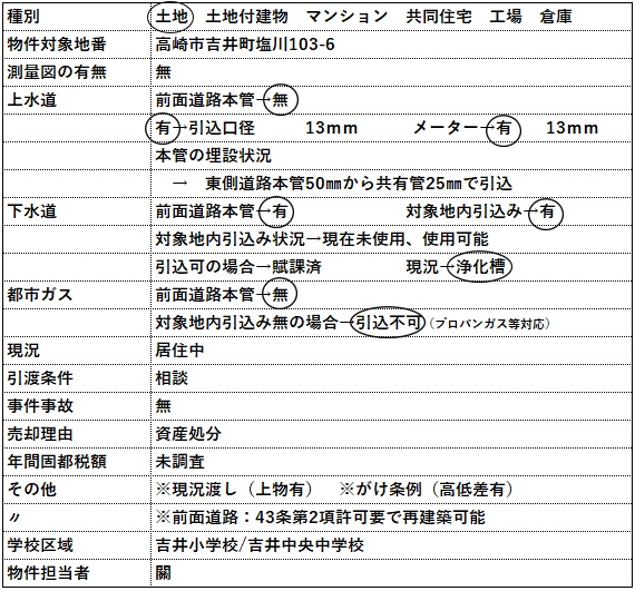 | コメント | 物件等についてのお問い合わせは、可能な限りメールやFAXにてお願い致します。 電話でのお問い合わせの場合には、担当者が電話対応中や外出中の場合には出られない事が ありますので、ご理解いただけると助かります。 □現在居住中です。 □現況渡し カーナビ入力:高崎市吉井町塩川103-6