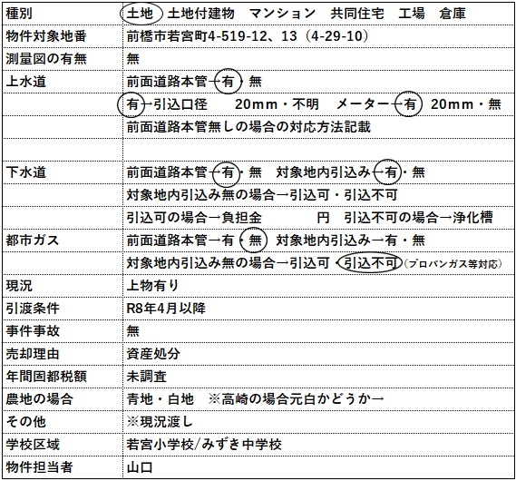 | コメント | 物件等についてのお問い合わせは、可能な限りメールやFAXにてお願い致します。 電話でのお問い合わせの場合には、担当者が電話対応中や外出中の場合には出られない事が ありますので、ご理解いただけると助かります。 カーナビ入力:前橋市若宮町4-29-10 □現況渡し □R8年 4月以降引渡し |
