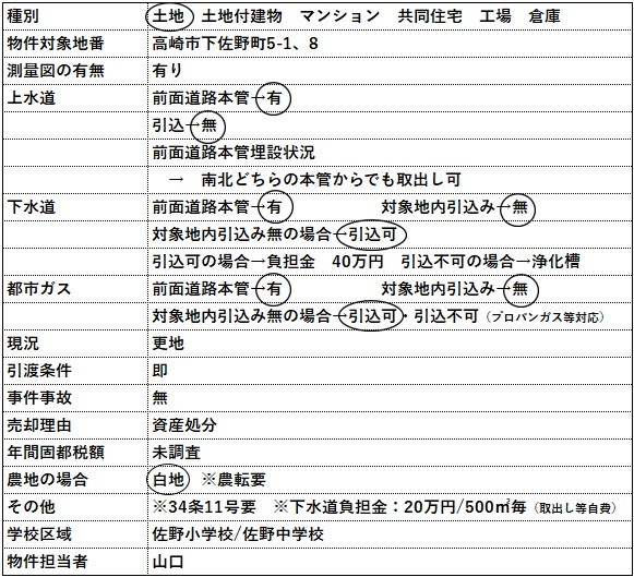 | コメント | 物件等についてのお問い合わせは、可能な限りメールやFAXにてお願い致します。 電話でのお問い合わせの場合には、担当者が電話対応中や外出中の場合には出られない事が ありますので、ご理解いただけると助かります。 カーナビ入力:高崎市下佐野町4-2付近 |
