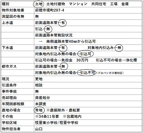 | コメント | 物件等についてのお問い合わせは、可能な限りメールやFAXにてお願い致します。 電話でのお問い合わせの場合には、担当者が電話対応中や外出中の場合には出られない事が ありますので、ご理解いただけると助かります。 カーナビ入力:前橋市堤町207-5付近 |