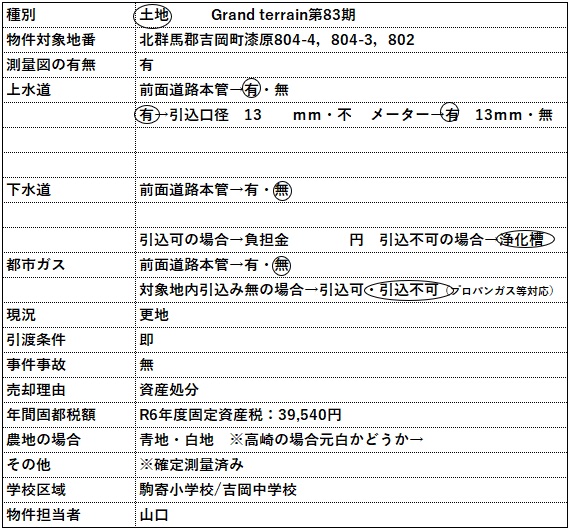 | コメント | 物件等についてのお問い合わせは、可能な限りメールやFAXにてお願い致します。 電話でのお問い合わせの場合には、担当者が電話対応中や外出中の場合には出られない事が ありますので、ご理解いただけると助かります。 カーナビ入力:北群馬郡吉岡町漆原804-4 |