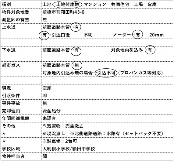 | コメント | 物件等についてのお問い合わせは、可能な限りメールやFAXにてお願い致します。 電話でのお問い合わせの場合には、担当者が電話対応中や外出中の場合には出られない事が ありますので、ご理解いただけると助かります。 □現況渡し □残置物撤去(売主負担) カーナビ入力:前橋市前箱田町43-6 【動画公開中】 |