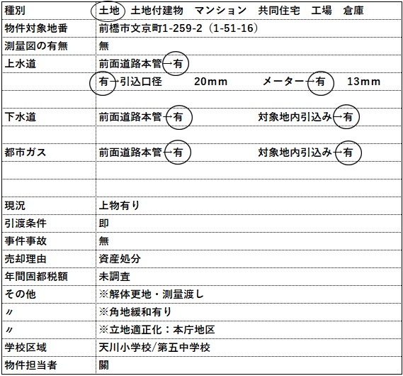 | コメント | 物件等についてのお問い合わせは、可能な限りメールやFAXにてお願い致します。 電話でのお問い合わせの場合には、担当者が電話対応中や外出中の場合には出られない事が ありますので、ご理解いただけると助かります。 □解体更地測量渡し カーナビ入力:前橋市文京町1-51-16 【動画公開中】