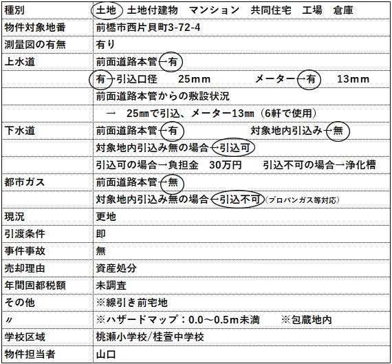| コメント | 物件等についてのお問い合わせは、可能な限りメールやFAXにてお願い致します。 電話でのお問い合わせの場合には、担当者が電話対応中や外出中の場合には出られない事が ありますので、ご理解いただけると助かります。 カーナビ入力:前橋市西片貝町3-72付近