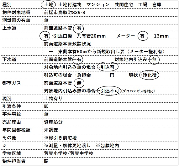| コメント | 物件等についてのお問い合わせは、可能な限りメールやFAXにてお願い致します。 電話でのお問い合わせの場合には、担当者が電話対応中や外出中の場合には出られない事が ありますので、ご理解いただけると助かります。 カーナビ入力:前橋市鳥取町829-8 |