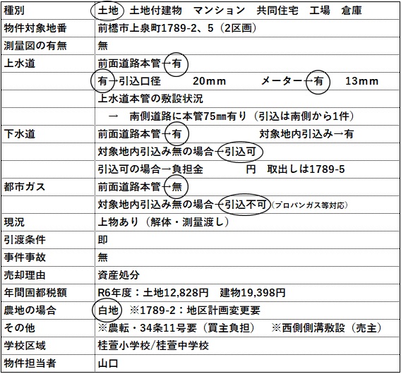 | コメント | ※物件等についてのお問い合わせは、可能な限りメールやFAXにてお願い致します。 電話でのお問い合わせの場合には、担当者が電話対応中や外出中の場合には出られない事が ありますので、ご理解いただけると助かります。 A区画 カーナビ入力:前橋市上泉町1789-2 |