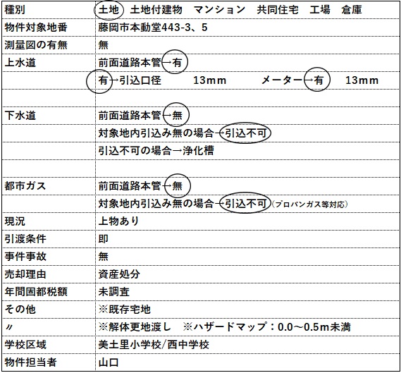 | コメント | ※物件等についてのお問い合わせは、可能な限りメールやFAXにてお願い致します。 電話でのお問い合わせの場合には、担当者が電話対応中や外出中の場合には出られない事が ありますので、ご理解いただけると助かります。 □既存宅地 □解体更地渡し カーナビ入力:藤岡市本動堂443-3 |